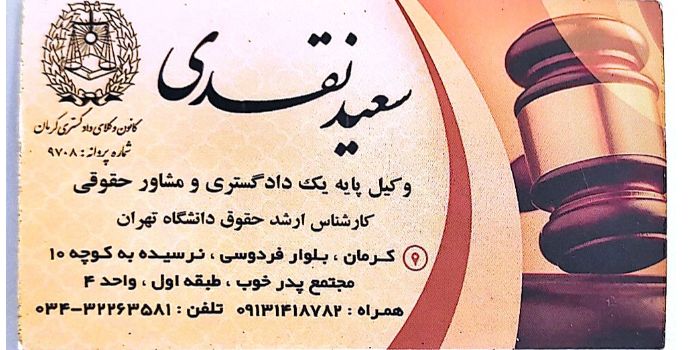 نمایه مشاغل حقوقی سایت صلح؛ مرجع حقوقی ایران به صورت دوره ای بروز رسانی می شوند. با این وجود این امکان وجود دارد که در فواصل بروز رسانی مجوزها و وضعیت شغلی برخی از متخصصین درج شده در وبسایت دستخوش تغییر شده باشد. بنابراین از شما خواهشمندیم هنگام مراجعه به متخصصین از صحت و تمدید مجوزهای شغلی مربوطه اطمینان حاصل فرمایید. بدیهی است که صلح؛ مرجع حقوقی ایران هیچ گونه مسوولیتی در این مورد برعهده نمی گیرد.