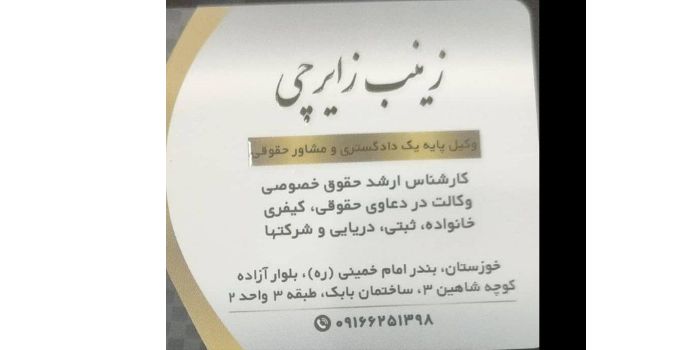زینب زایرچی رویس، وکیل پایه یک دادگستری با پروانه وکالت از کانون وکلای دادگستری استان خوزستان، با اتکا به دانش عمیق و تجارب ارزنده خود در عرصه حقوق، نمادی از تعهد، تخصص و پشتکار است. او که دانشآموخته لیسانس حقوق از دانشگاه شهید چمران اهواز و کارشناسی ارشد حقوق خصوصی از همان دانشگاه است، در دوران تحصیل به عنوان دانشجوی نمونه و عضو دفتر استعدادهای درخشان دانشگاه نیز شناخته شده است. اما افتخارات ایشان به اینجا ختم نمیشود. وی در دوران دانشآموزی نیز با کسب رتبه برتر در آزمون علمی و درخشش در کنکور سراسری، خود را به عنوان فردی ممتاز و برجسته معرفی کرد. علاوه بر این، ایشان با تسلط کامل بر زبان عربی و درک زبان انگلیسی و همچنین مهارتهای کامپیوتری و اینترنت، تبحر خود را در زمینه لایحه نویسی، دادخواستنویسی، قراردادنویسی و شناسایی و مدیریت ریسک به اثبات رسانده است. او همچنین با شرکت فعالدر المپیاد دانشجویی حقوق و کسب گواهی پذیرش مقاله در سومین کنفرانس بینالمللی دانش و فناوری، حقوق و علوم انسانی ایران برای ارائه مقاله "حقوق و تعهدات مالک کشتی در قراردادهای اجاره کشتی" و شرکت در دورههای تخصصی وکالت حرفهای، قراردادنویسی و دعاوی ملکی، علاقه وافر خود به علم حقوق و تعهد به ارتقای دانش و تخصص خود را بهطور ملموس نشان داده است. اما تجربیات ایشان در عرصه وکالت، گویای تمام تواناییها و تعهدات اوست. سالها وکالت دادگستری و ارائه مشاورههای حقوقی در زمینههای مختلف از جمله دعاوی حقوقی، ثبتی، املاک و اراضی، خانواده و امور حسبی و دعاوی کیفری و تنظیم انواع قراردادها مواردی هستند که مهر تأییدی بر تجارب ارزشمند و تخصص ایشان میزنند.